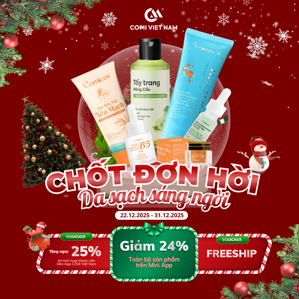 Noel tới rồi – Đừng quên yêu thương làn da của bạn, giữa bộn bề cuối năm, hãy dành cho làn da sự chăm sóc xứng đáng. COMI Việt Nam luôn sẵn sàng đồng hành để bạn sạch da – khỏe da – sáng ngời , tự tin tận hưởng trọn vẹn mùa lễ hội và chào đón năm mới.
